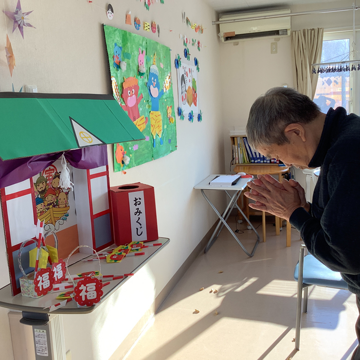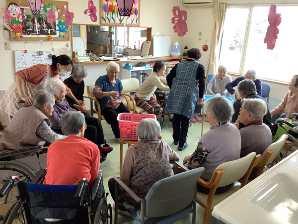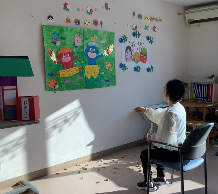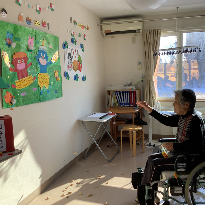 節分行事として豆まきを行いました。 職員扮する鬼が登場すると驚かれる方や笑顔を見せて下さる方等、様々な表情が見られ賑やかな時間となりました。 皆さまの一年が、健康で穏やかな日々となります様、無病息災を願いました。